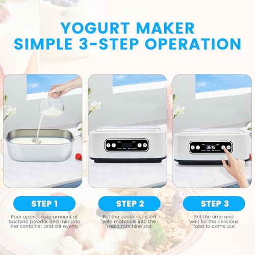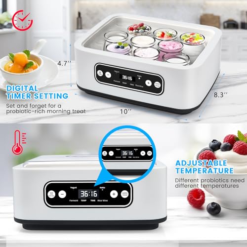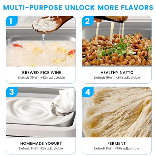 - Multifonction 4-en-1 yaourtière: Préréglage en un clic pour créer des yaourts laitiers/végétaux, du natto traditionnel, des sauces fermentées ou du vin de riz. Minuterie réglable de 1 à 99 heures pour les formules de production en série rapide ou de fermentation lente. L’affichage à LED simplifie le choix du programme, qu’il s’agisse de préparer un Kéfir riche ou un produit délicatement fermenté à la main pour un repas délicieux